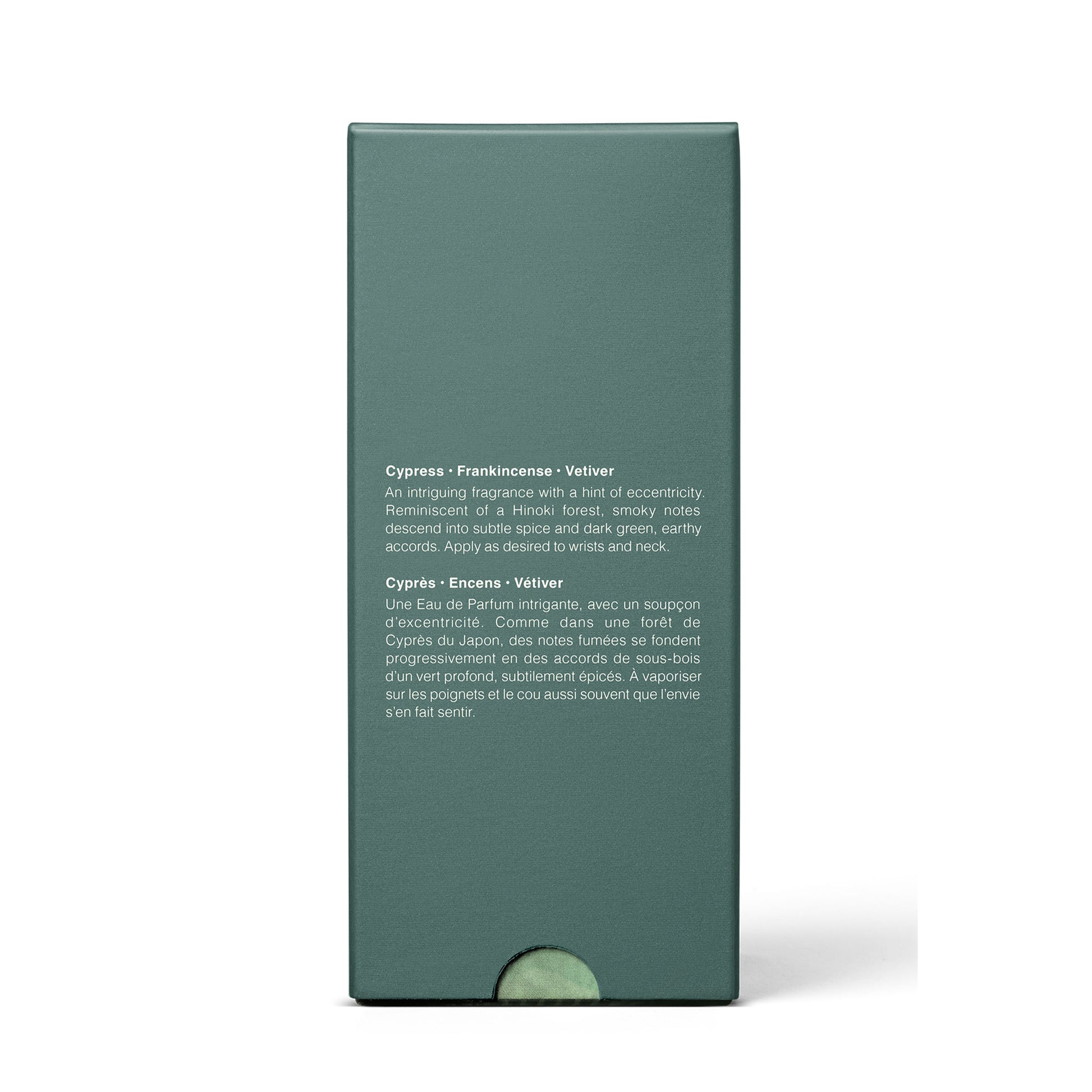 An intriguing fragrance with a hint of eccentricity. Reminiscent of a Hinoki forest, smoky notes descend into subtle spice and dark green, earthy accords.