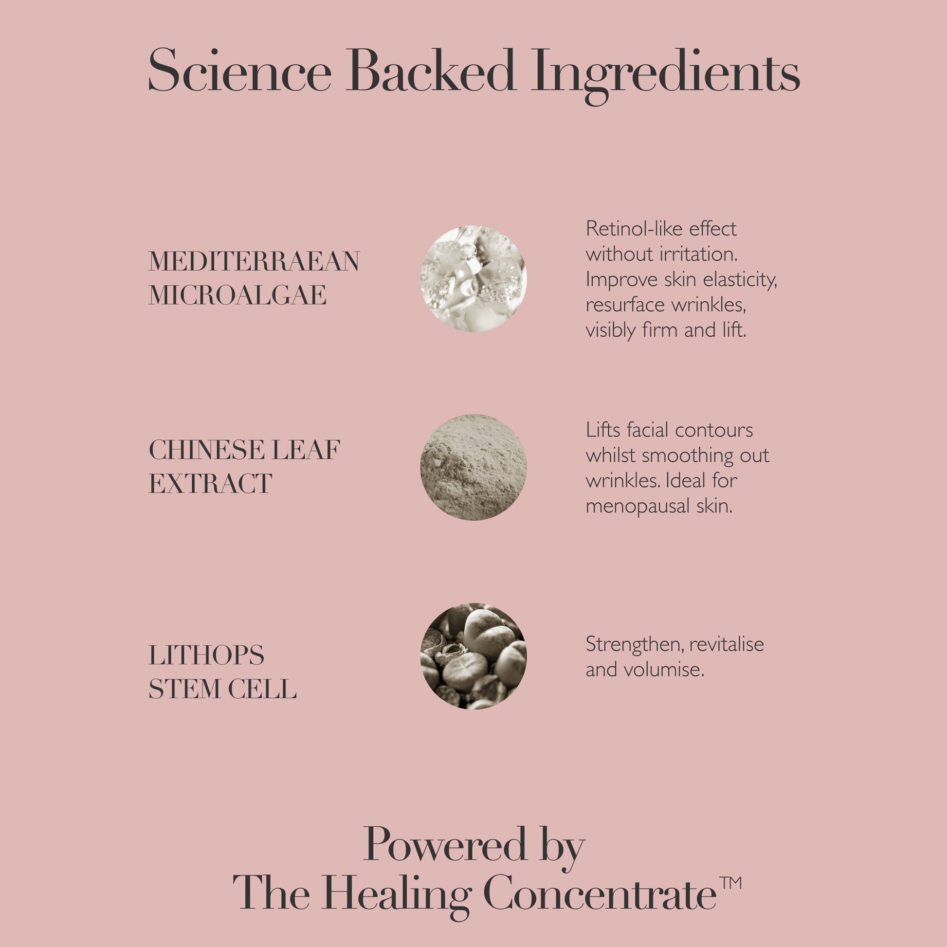 Clinically proven to reduce wrinkle depth in just 30 minutes, Queen Serum delivers transformative results for a firmer, lifted, and radiant complexion. Its non-sensitising formula harnesses retinoid Mediterranean Microalgae for a retinol-like effect without irritation, making it ideal for all skin types, including sensitive and menopausal skin. Lithops Stem Cells provide regenerative support to strengthen and volumise skin, while Chinese Leaf Extract helps lift and smooth.