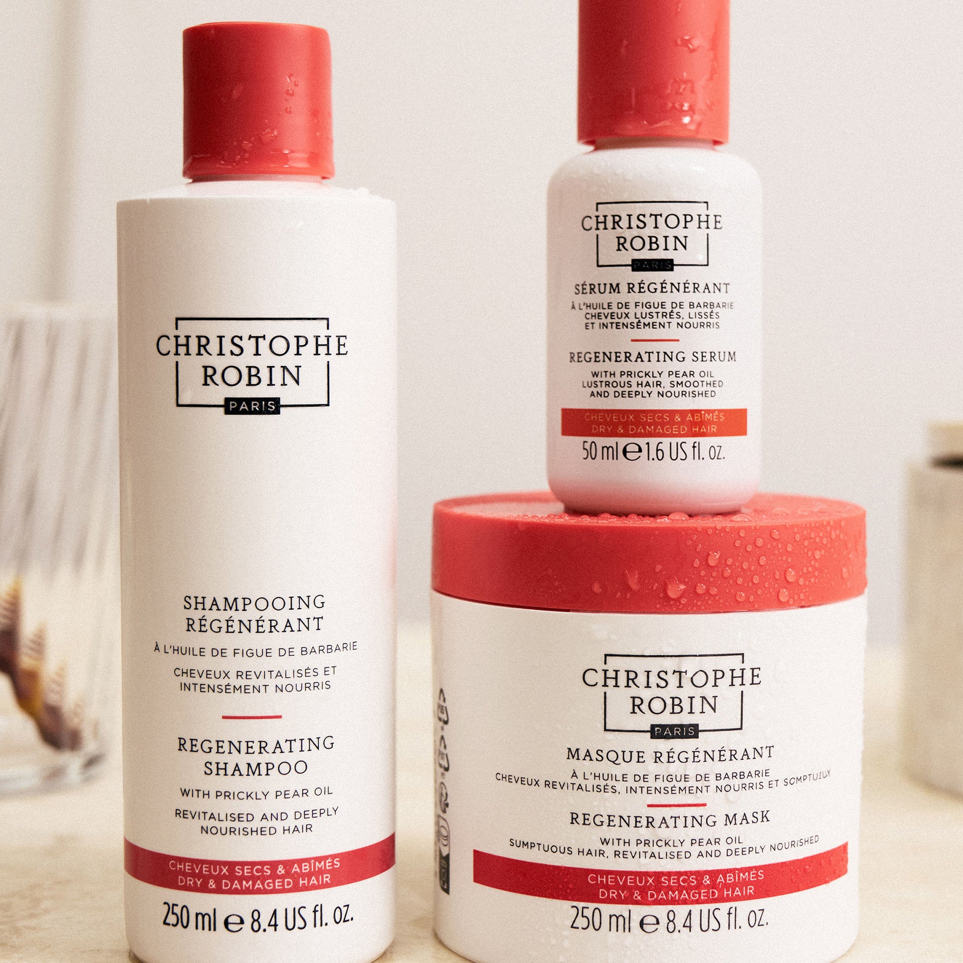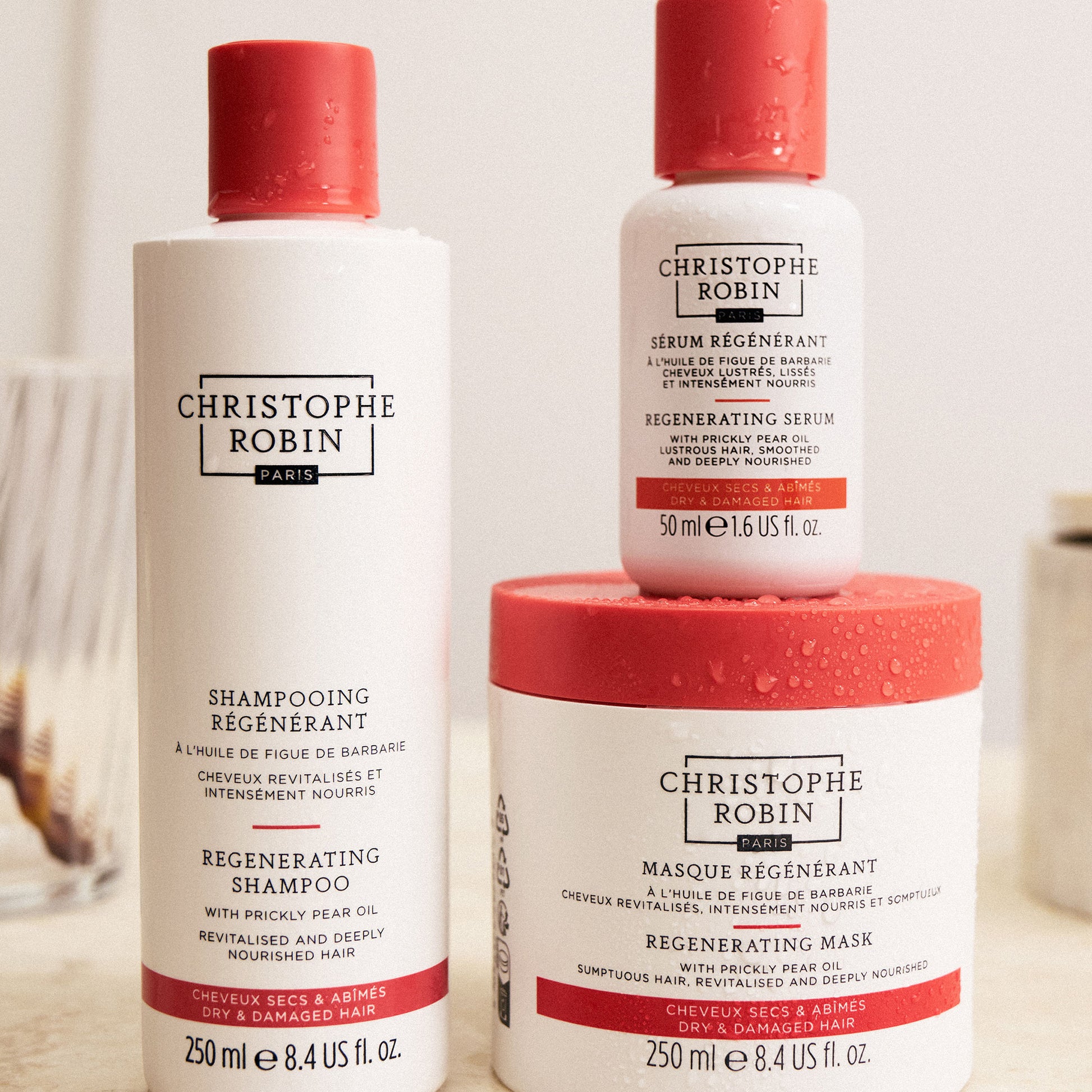 – After the Regenerating Shampoo, apply a small amount of the mask by massaging from roots to tips.