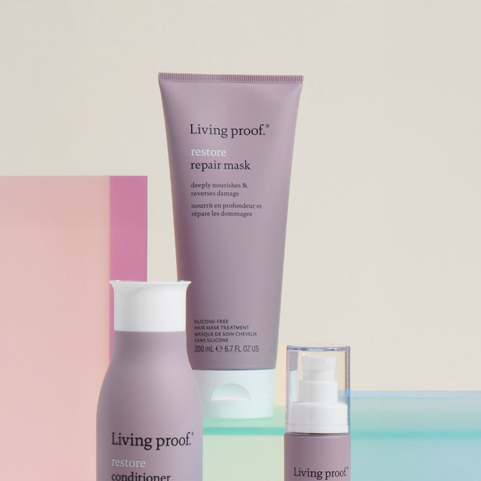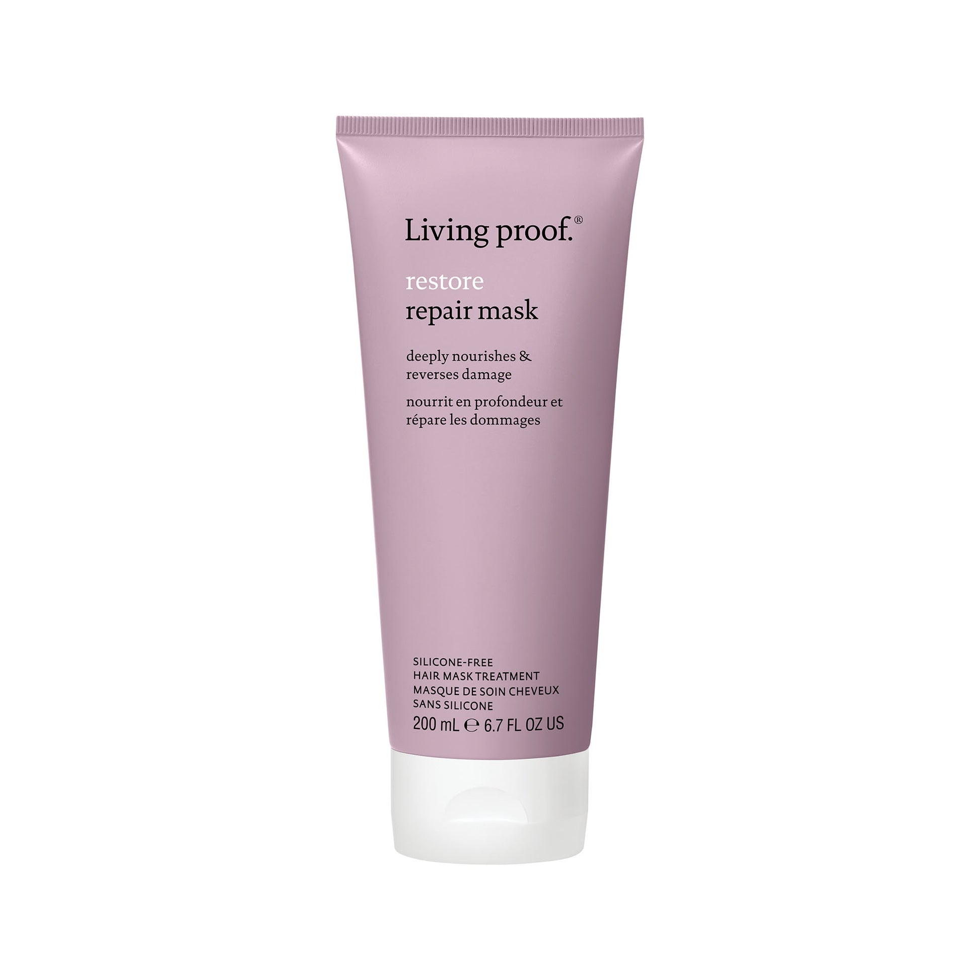 — Use this mask in the shower, then apply Living Proof Restore Repair Leave-In (sold separately) to damp hair to strengthen, silkify, and prevent split ends.