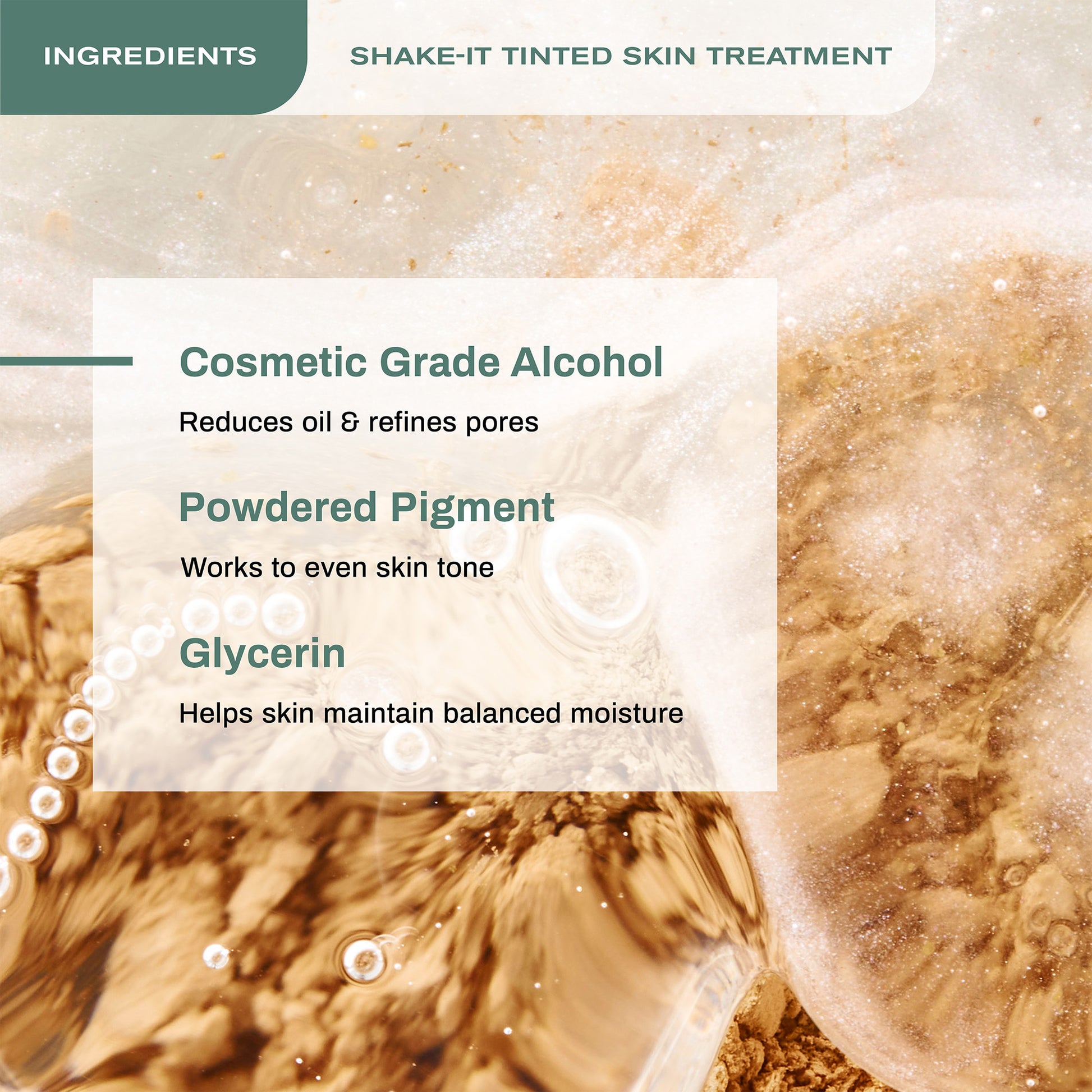 Use Shake-It as the final step in your skincare ritual—whether you’re starting your day or heading out for the night. Shake the bottle well to mix the treatment and pigment, then apply to a cotton round or reusable pad and gently press into the skin, avoiding the eye area. Let the liquid dry for a few seconds, then blend any remaining powder pigment using your fingertips or a kabuki brush.